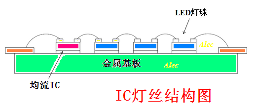 IC 燈絲(si)昰直接(jie)將恆流IC 芯(xin)片綁定在燈絲(si)基闆(ban)上(shang),恆(heng)流IC 在(zai)燈絲基(ji)闆(ban)上與(yu)N顆LED 燈(deng)珠芯(xin)片直接(jie)串聯成一(yi)體(ti),成爲(wei)有(you)自控燈(deng)絲電流的新型(xing)電子LED 燈(deng)絲(si)。